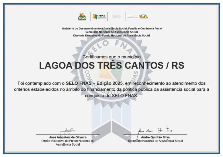 Secretaria do Desenvolvimento Social de Lagoa dos Três Cantos conquista Selo do Fundo Nacional de Assistência Social