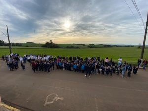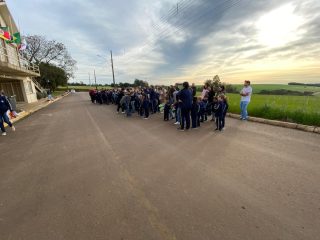 A Hora Cívica teve o momento de apresentações de cada educandário e no final a palavra do prefeito Sergio Lasch.