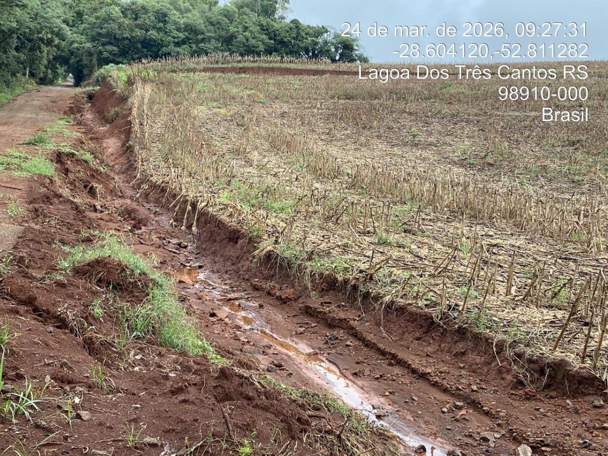 Chuvas torrenciais do final de semana danificam estradas do interior de Lagoa dos Três Cantos