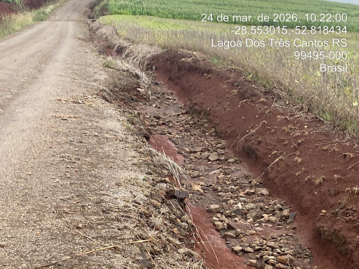 Chuvas torrenciais do final de semana danificam estradas do interior de Lagoa dos Três Cantos